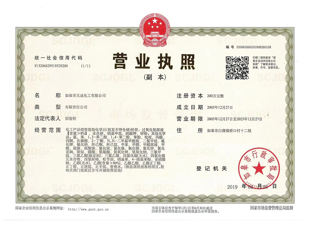 ? 如皋市天成化工有限公司創(chuàng)建于1996年。公司地處于美麗富饒的長江三角洲,座落在古鎮(zhèn)林梓,通揚運河河畔。南瀕長江、西臨204國道,距南通港、飛機場30公里,立體交通發(fā)達。公司經(jīng)營管理規(guī)范,技術(shù)力量雄厚,擁有一批高、中級專業(yè)技術(shù)人才。